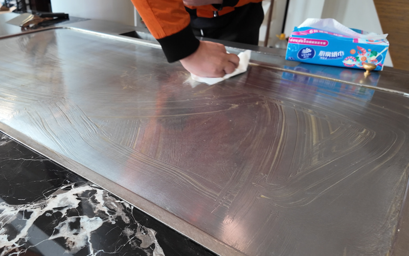 2、用鏟子清除臺面上的防銹保護油,用廚房用紙或毛巾將煎板擦拭干凈(或直接用廚房用紙擦拭)